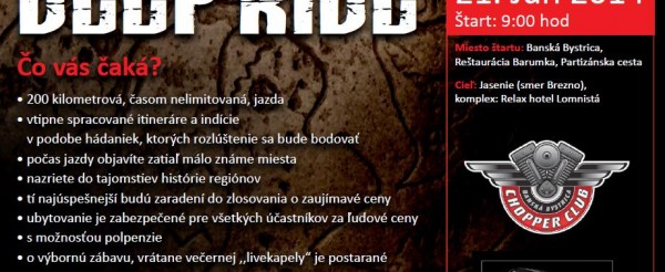 Jeep Wrangler club Slovakia & Chopper club BB Vás pozýva na 200 kilometrovú, časom nelimitovanú jazdu. Účastníci obdržia vtipne spracované itineráre a indície v podobe hádaniek, ktorých rozlúštenie sa bude bodovať.